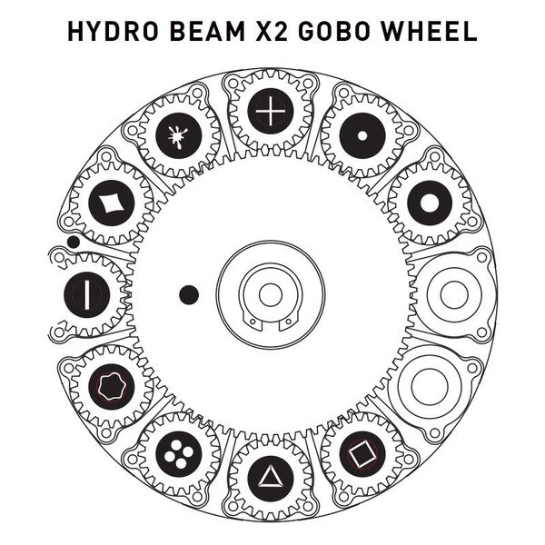 - 1 GOBO Wheel with 5 glass GOBOs, 3 metal GOBOs and 3 GOBO reducers + open