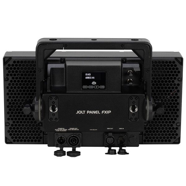 The rear panel has conveniently located IP65-rated 5-pin DMX in/out connections along with IP65-rated locking power in/out sockets to daisy chain power. There are also holes to connect an omega bracket to the Jolt Panel FXIP as an alternative to its variable angle bracket.
