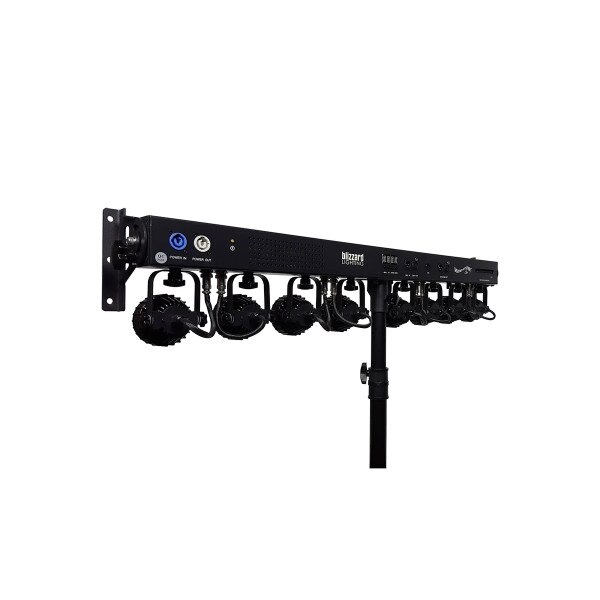 These fixtures come with industry standard PowerCON® compatible power Input/Output connections, 3-pin DMX Input/Output connections, DMX Sync Output (output for cable linked M/S setups with single footswitch control), and dual mounting brackets with locking knobs for the extra option of free-standing just the fixture or truss mounting.