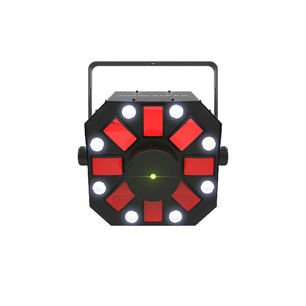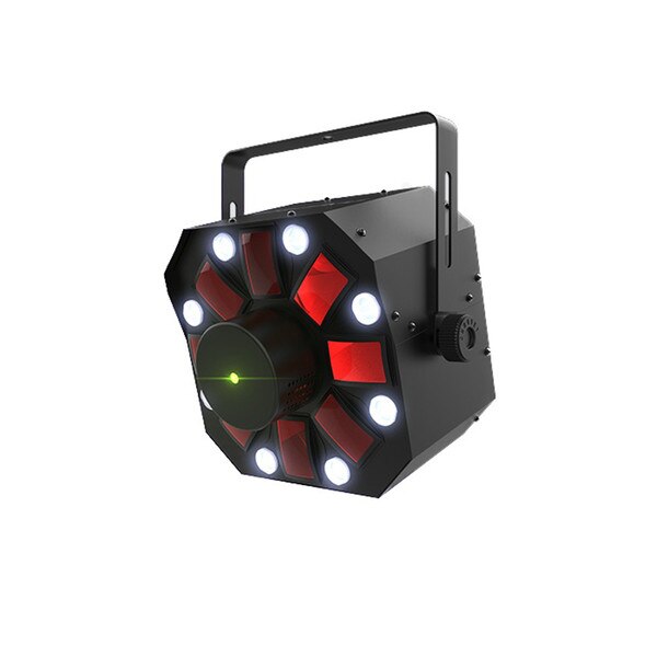 - 3-in-1 LED light that includes an RGBAW rotating derby, red/green laser, and white strobe effect