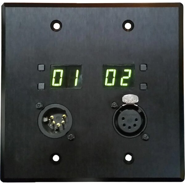 The NODE2 has two front mounted DMX512 ports which can be configured as either input or outputs. The standard unit is provided with two female DMX output connectors. Each port has an associated two-digit display with up/down push buttons which are used to select the DMX universe number for that port. This allows easy system configuration in the field without the need to connect a computer. DMX universes 1 – 99 are accessible using the buttons and displays. For security, the DMX universe selection cannot be changed while a cable connector is inserted. When ports are configured for universe numbers above 99, the local buttons are locked out from modifying the configuration.