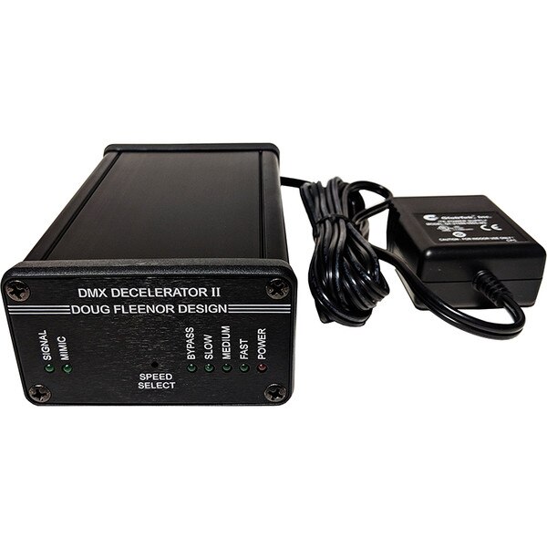 The DMX Decelerator is a DMX512 isolator and re-timing device. It can receive any signal within the DMX512 specification and it can accept some signals outside of the specification. It produces a DMX output signal with “relaxed” timing characteristics which are required by some DMX receiving devices.