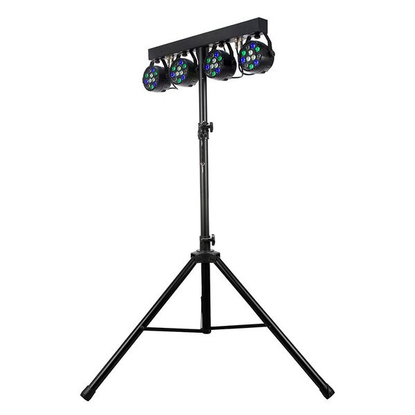 The Eliminator Lighting Mini Par Bar will bring any room to life with washes of colored light. The all-in-one system includes four plastic LED Pars mounted on a linear base with a single power source, a metal tripod stand to mount the linear base on, a wireless remote and a transportation bag. Each LED Par fixture includes twelve 1-Watt LED (RGBW) and may be manually rotated so that users can aim the light in a desired direction.