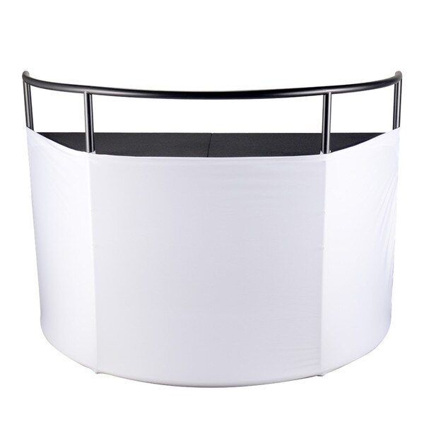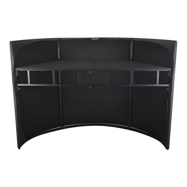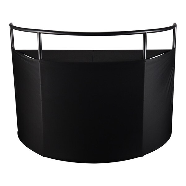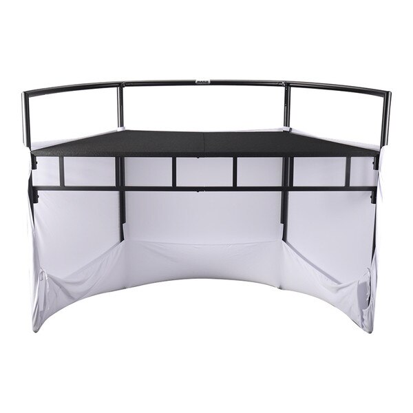 The JMAZ Command Booth Event Facade with Black and White Scrims is a versatile solution for DJs and event professionals. Featuring adjustable, washable scrims and detachable sections, it includes a sturdy steel pipe construction and a command table for controllers or gear. The table measures 34" x 24" at the front, 65" x 24" at the back, and is 35" high. Comes with a carrying bag, black and white scrims, assembly accessories, and a manual for easy setup.