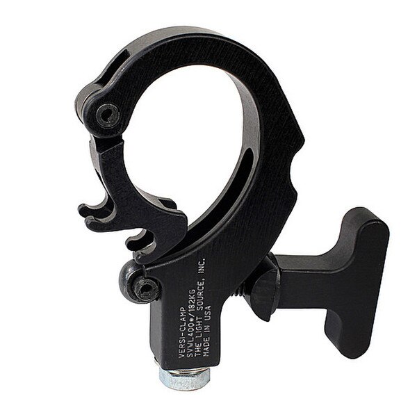 The Versi-Clamp wraps around the entire range of standard truss, from 2" OD down to 1" OD, all without marring the truss. The unique 2 position latch on the link saves time when switching from 2" truss to a small truss, just connect to the second latch for the smaller sizes. The quick release handle takes only 2 turns to be able to drop the locking mechanism, and release the clamp from the truss.
