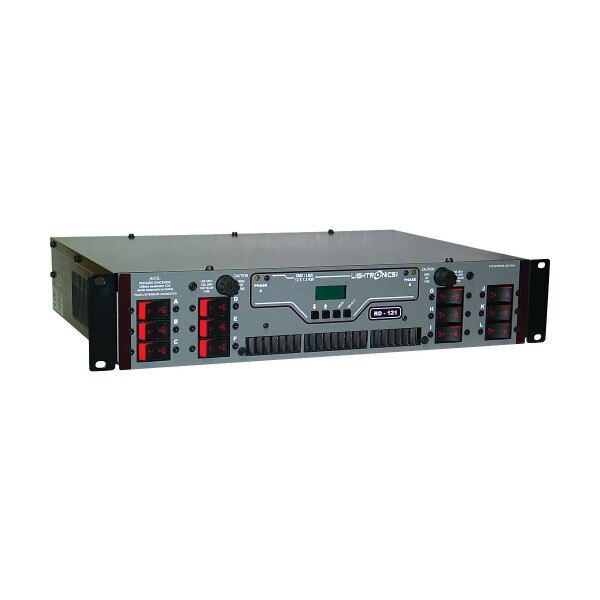 The RD121 is a 14,400 Watt, 12 channel, rack mount lighting dimmer. It is suitable for church, stage, theater, school, night club, live performances and other event and artistic applications. Each of the channels has a capacity of 1200 Watts. It is controlled via low voltage signals which may be LMX-128 (3 wire multiplex), or USITT DMX- 512. The unit is fan cooled. Channels may be independently assigned from the unit. The unit is over temperature and over voltage protected and has a magnetic circuit breaker for each channel.