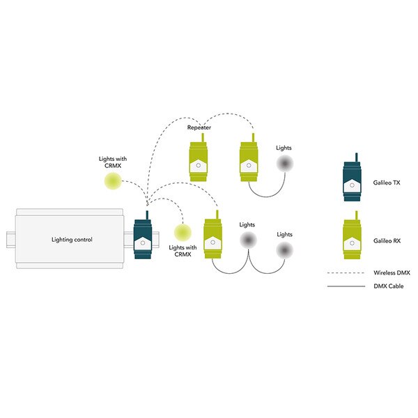 Using RDM (Remote Device Management) available in Galileo you are able to configure and monitor fixtures and receiver devices, both wired and wireless, using any RDM controller. At a later stage this can also be done with the CRMX Toolbox App using the Bluetooth connectivity.