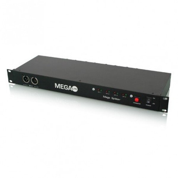 The Mega Splitter is a universal splitter with two inputs and four outputs. Each output and input has a 3-pin and 5-pin XLR connectors. Electronic isolation is used between input and output, and output and output. Its dimensions are 19” W x 6” L x 1.75”H. It is sized perfectly for rack mounting front or back and is also wall mountable.