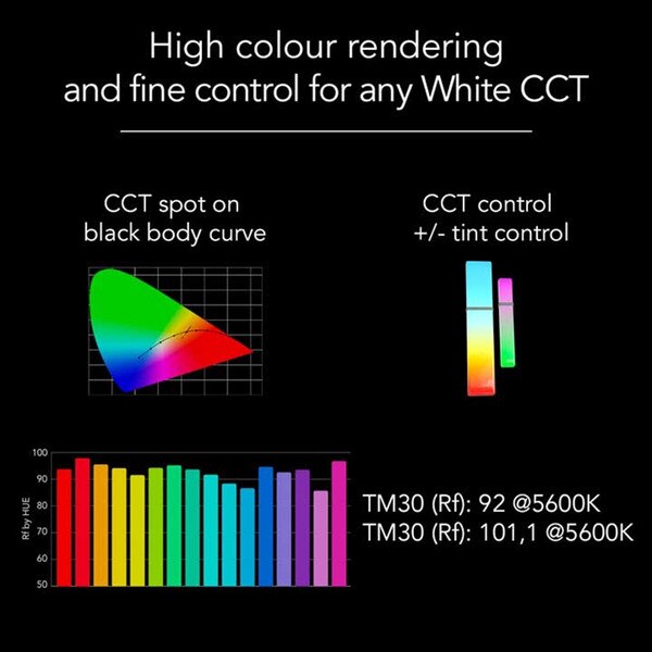- Industry-standard colour gels matching, tungsten emulation on dimming, tint control (+/- green)